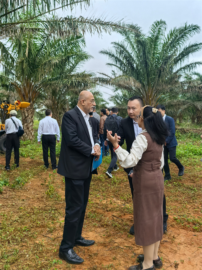 ▲公司首席財xícái務官wùguān江jiāng俊豪jùnháo(右(yòu二))與拿督巴威斯博士(左一)、海南油yóuzōng棕研究中心主任曹紅星博士(右一)交流liú