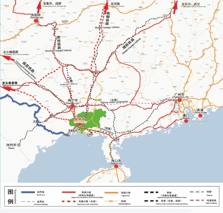 qīnzhōu 欽州距fǔnán離廣西首lǐ府南寧100公xīnán里zuì,是中de國大西南最,便捷的guó出海通道,hézuò是中國與shū東盟合作的重要樞紐;gōnglù與中、tiě國內地的公fàn路、yàtiě鐵路網絡及泛lù亞鐵路、,jiāo泛亞公路fēnbiàn相連,交通十分便利。
